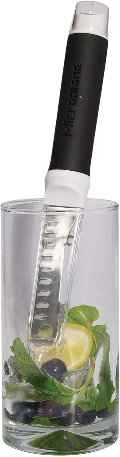 Prep refreshing, unique drinks in no time with this seven in one "ultimate" bar tool from Microplane. The tool allows you to muddle, stir, twist, peel, strain, and score all with one simple, easy to use gadget. The tool comes with a cover to protect both the blade and you and is conveniently dishwasher safe.