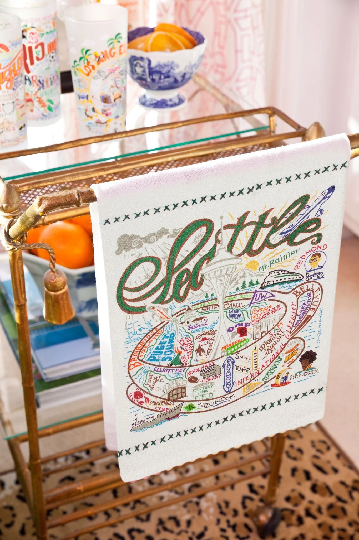 This original design celebrates the University of Washington. Go Huskies! Our original design is printed using the labor intensive hand-swipe silk-screen process with 12 colors (that's 12 screens used for each towel!). The design is framed with a hand-embroidered border on a 100% hand-loomed cotton towel generously sized at 20x29 inches. All t...